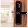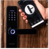 Fechadura digital WiFi com desbloqueio via senha, biometria ou aplicativo. Permite acessar o registro de acessos, compartilhar com outras pessoas ou então criar senhas temporárias à distância.
